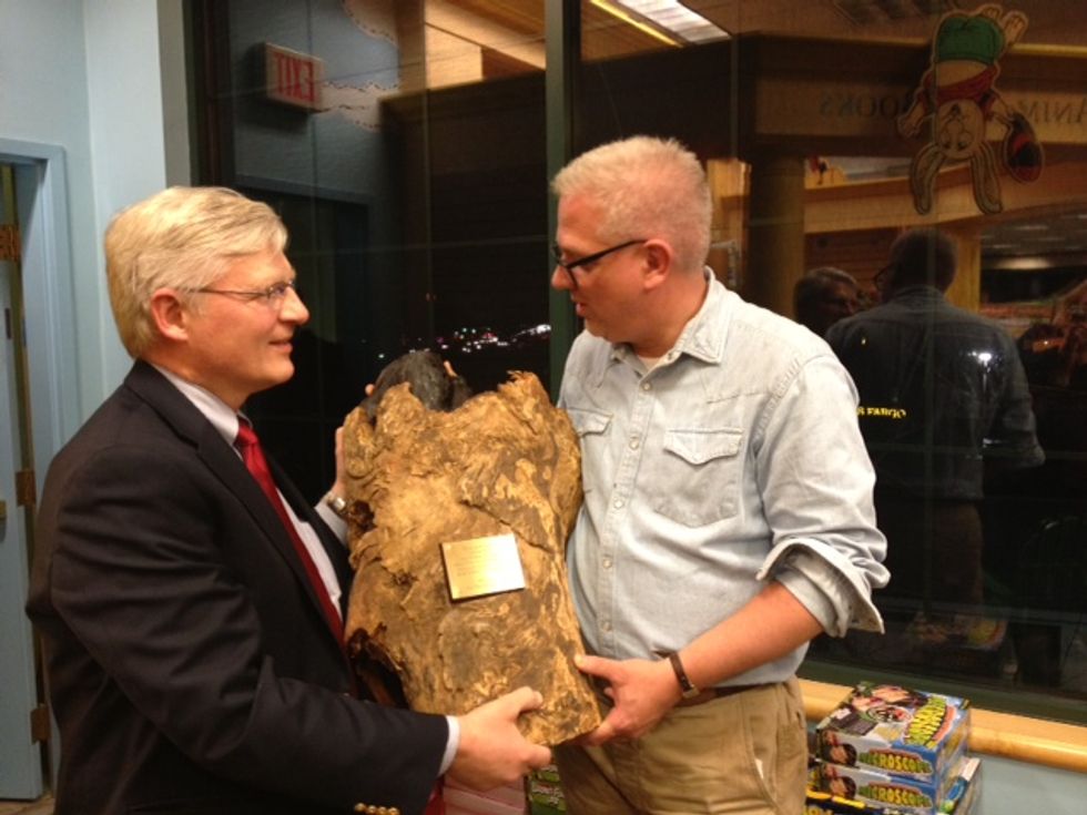 One of the great things about Glenn going on the road is the stuff that fans always seem to bring for him. Sometimes it's "normal" stuff likes books and letters, but other times something extraordinary pops up. Yesterday, at the King of Prussia stop, Peter Lillback, the outstanding author of George Washington's Sacred Fire, presented Glenn with a piece of wood salvaged from one of the 13 original Liberty Trees (each colony had one). Glenn, who's no stranger to historical artifacts, even looked pretty surprised.