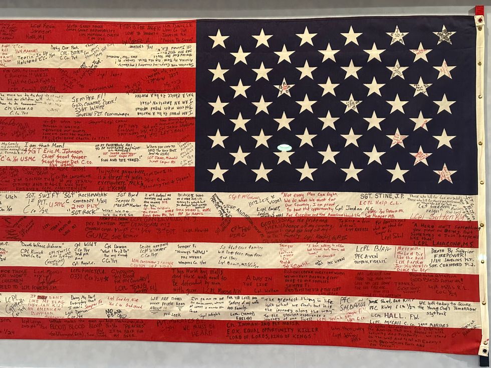 Imagine—it's March 2003, America is still recovering from the horror of the 9/11 terrorist attacks, and a group of young men full of courage and determination board a plane in Germany bound for Kuwait City to engage in the initial attack of the Iraqi Freedom Campaign. These Marines, most of whom were fresh out of BootCamp and had never faced battle before, were asked to sign this flag by Flight Attendant Sarah Carruthers.