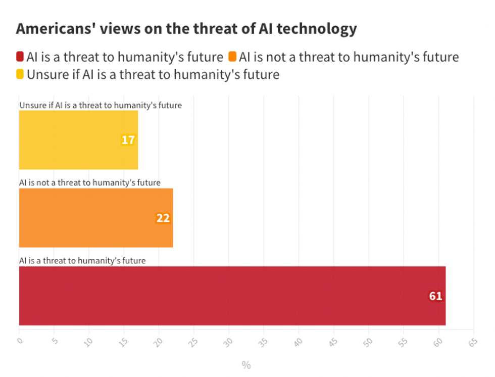 It is no wonder why 61 percent of Americans think AI poses a real threat to human civilization, according to a poll recently published by Reuters and Ipsos. To put that in perspective, nearly two-thirds of ALL Americans think AI poses an existential threat. Only 22 percent of Americans are not threatened by AI, while the jury is still out with the remaining 17 percent.