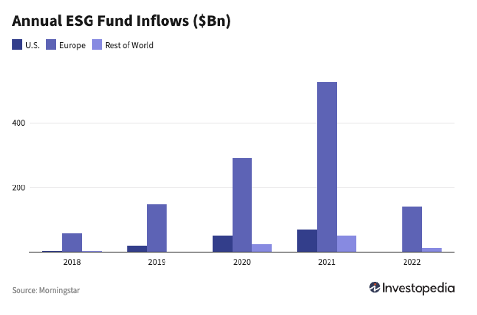 Global Investments in ESG Funds PLUNGED 76 percent globally in 2022 from $157.3 billion to $649.1 billion in 2021, with a 20 percent decrease in the U.S. ALONE. This marked the lowest annual net inflow for ESG funds since $69 billion in 2018.
