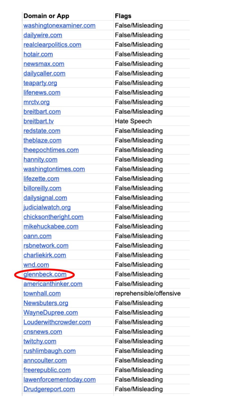 The aforementioned Microsoft-owned Xandr is one of the major ad companies using this list to restrict revenue to conservative media sources. An executive at an ad agency who contracts with conservative media outlets anonymously disclosed to the Washington Examiner a list of 37 conservative media outlets that Xander is financially punishing and censoring based on the fact that they are listed on GDI's "exclusion list." Glennbeck.com was included in this list alongside other conservative spokespersons' domains, including charliekirk.com, rushlimbaugh.com, billoreilly.com, hannity.com, and others.