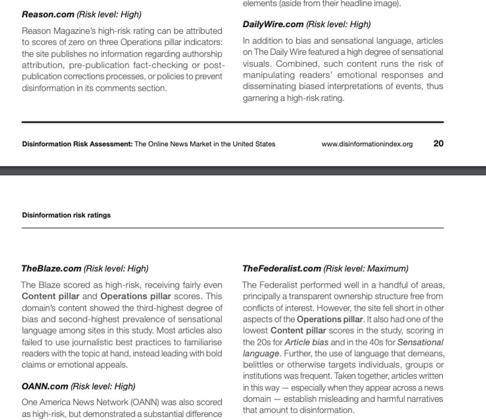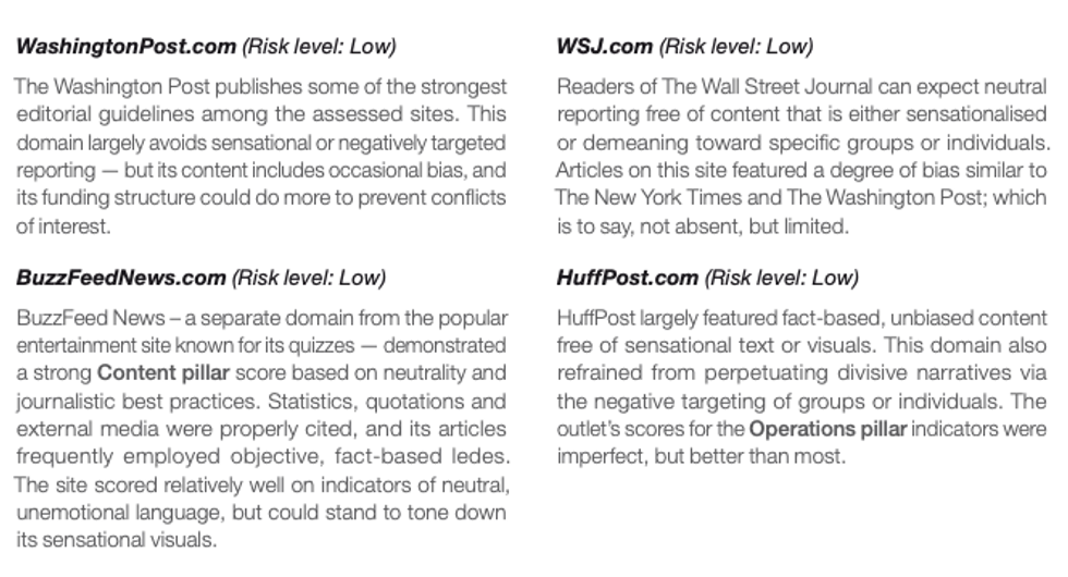 Among their "10 riskiest online news outlets" list included TheBlaze, Daily Wire, New York Post, and other conservative news outlets, accusing the sites of "bias" and "prevalence of sensational language." It is little surprise that their list of the "10 lowest-risk news outlets" included left-leaning sources like the Washington Post, New York Times, NPR, Buzzfeed News, Huffington Post, and others. The only centrist news source listed on their "10 lowest-risk news outlets" was the Wall Street Journal.