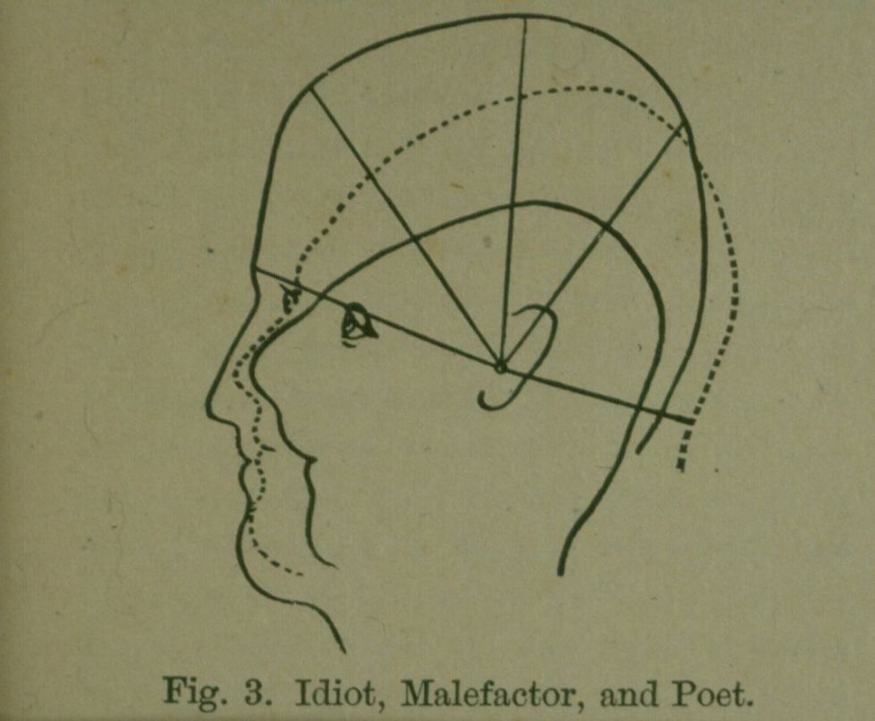 This image was taken from a phrenology textbook from the 1960s, a practice used to collect "eugenics data" alleging physical differences could distinguish an "idiot" from a "malefactor" from a "poet."