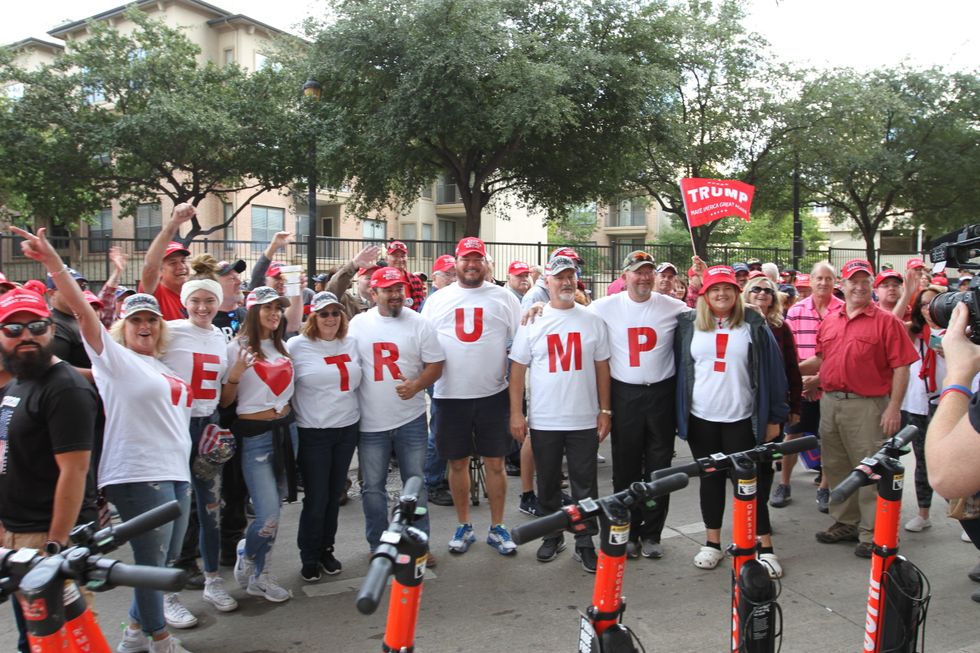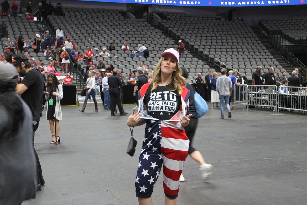 In nearby Grand Prairie, at the Theatre at Grand Prairie, Texas Democrat Beto O'Rourke held a competing rally. There were about as many people at O'Rourke's rally as people outside the Trump rally.