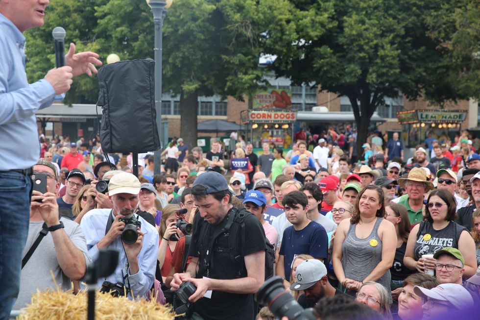Having just seen Sen. Kamala Harris (D-Calif.) at a small Baptist church, we ventured to the fair to see Bernie Sanders' riot of a Sunday speech. Bennet was on before him, so I got there early, and I paced off to get a restroom break. The media center is in the basement of the administration building, right by the Political Soapbox stage.