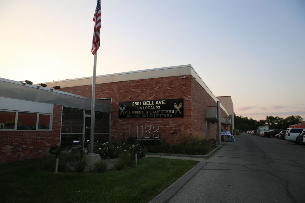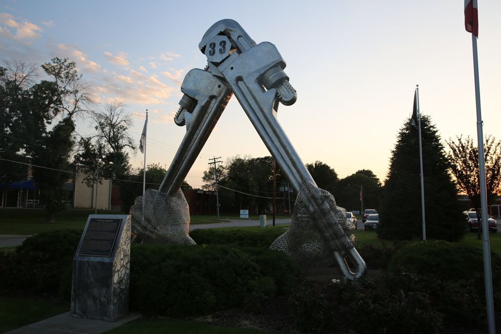 On the lawn of the Plumber's Union, a statue of two hands clenching pipe wrenches and fastening a socket. In front of it, a plaque titled "Pulling Together," which noted, "This piece of art is not only about unions. It is about the human condition."