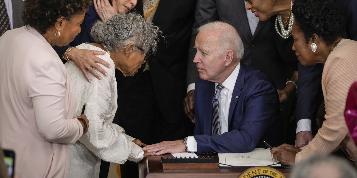 President Biden speaks with Opal Lee, known as the Grandmother of Juneteenth, after signing in Juneteenth as a federal holiday.