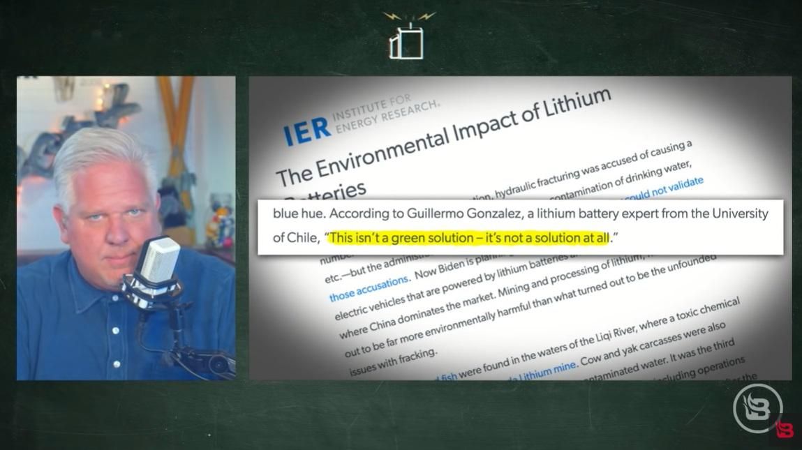 "Oh, and remember during the Obama administration when the world was gonna end' over fracking?" Glenn asked. "Well, the Institute for Energy Research now says, and I quote, 'Mining and processing of lithium, however, turns out to be far more environmentally harmful than what turned out to be the unfounded issues with fracking.'"