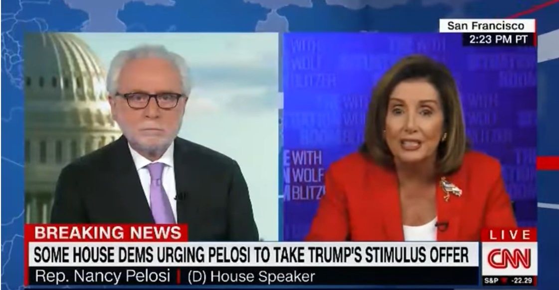 House Speaker Nancy Pelosi (D-Calif.) came unhinged when CNN's Wolf Blitzer dared to ask her why House Democrats won't compromise with the White House on the coronavirus relief bill they stress that Americans desperately need.