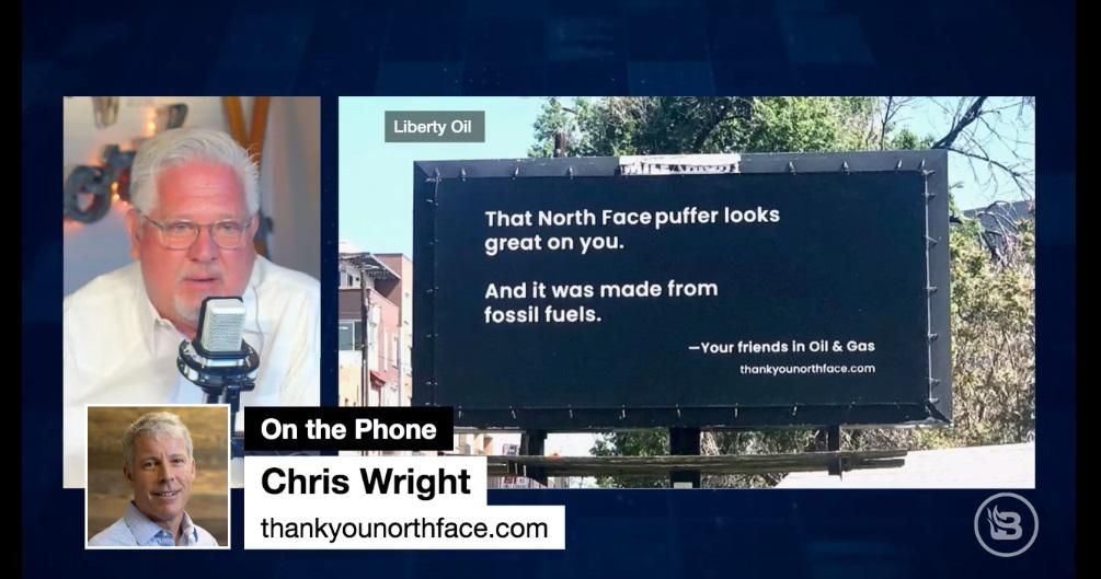 "I have been for years, trying to get a real, honest dialogue about energy going," Chris told Glenn. "So we took this opportunity to point out that North Face jackets are ... almost completely made out of oil and gas. How can you choose not to associate with the essential material your equipment [is] made out of? So we put a billboard up ... the billboard says, 'That North Face puffer looks good on you. And it was made from fossil fuels.'"