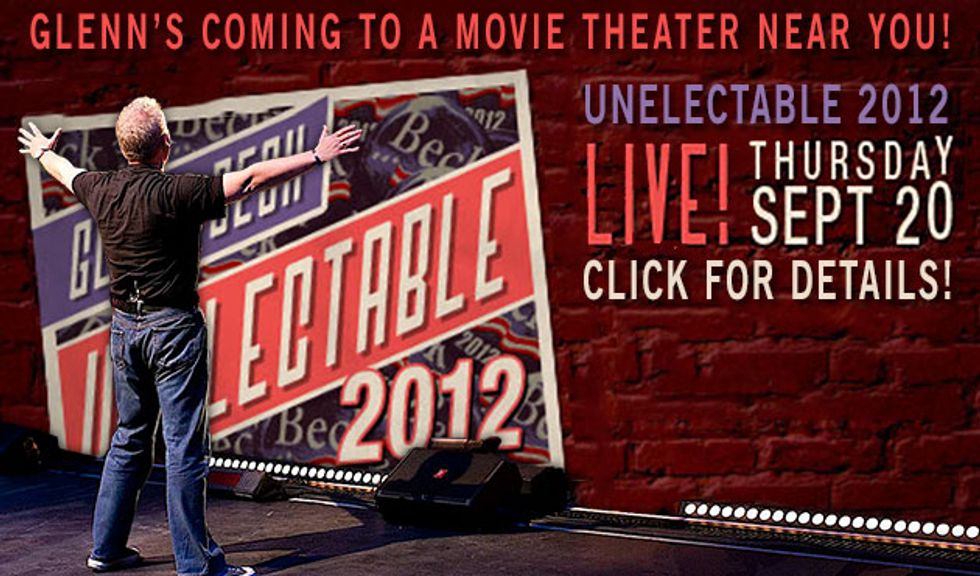 Today Glenn announced the last show of his comedy tour, Unelectable 2012, will be simulcast live in movie theaters nationwide on Thursday, September 20th. This show is full of comedy—it’s Glenn’s version of a presidential debate featuring the performers and writers from The B.S. of A. Many are saying it could be the funniest show Glenn’s ever done, and it ends with an inspiring message that will have you on your feet…laughing, cheering and full of hope. Get your tickets HERE now!
